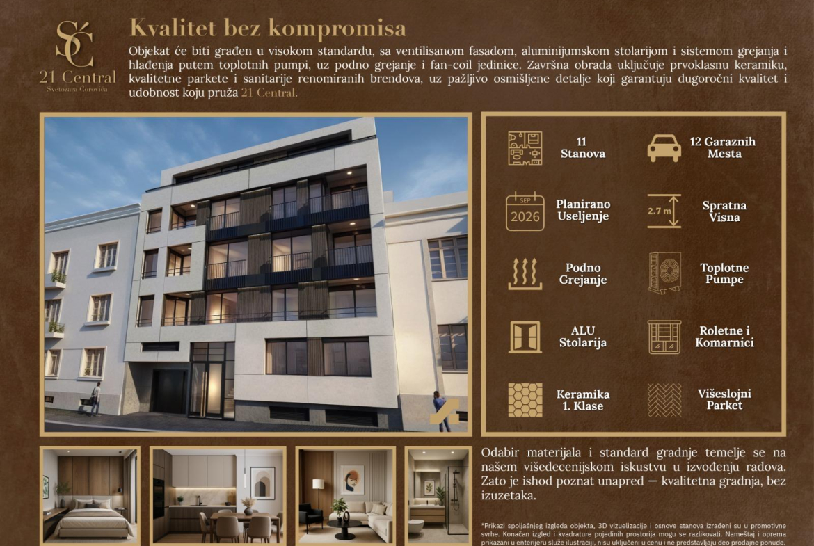 Stan odlikuje izuzetno funkcionalan raspored prostorija i pažljivo osmišljen enterijer koji pruža osećaj udobnosti, prostranosti i topline doma. U izgradnji se koriste materijali najvišeg kvaliteta: na podovima će biti postavljen parket(tarket) I klase, dok je keramika takođe I klase, sa modernim dizajnom i vrhunskom završnom obradom.